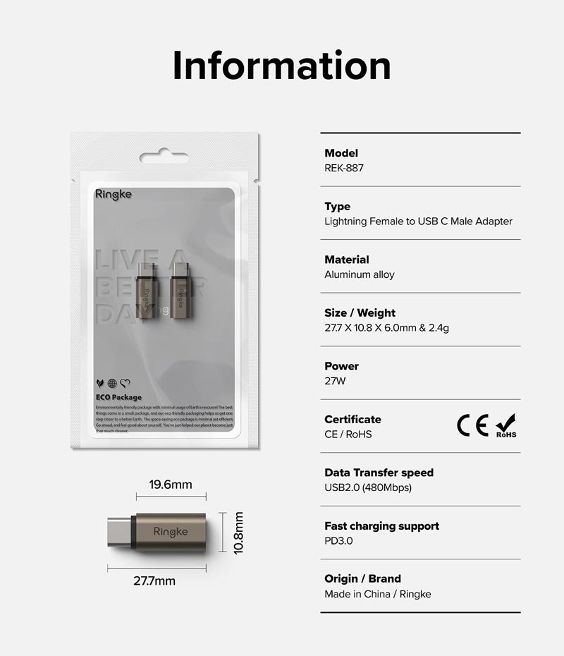 - Đầu chuyển Ringke LN to C OTG Adapter được thiết kế nhỏ gọn, màu sắc sang trọng giúp kết nối với bộ sạc thiết bị, sạc xe hơi, máy tính để bàn và laptop nhằm nâng cao sự tiện lợi tối đa trong cuộc sống hàng ngày.