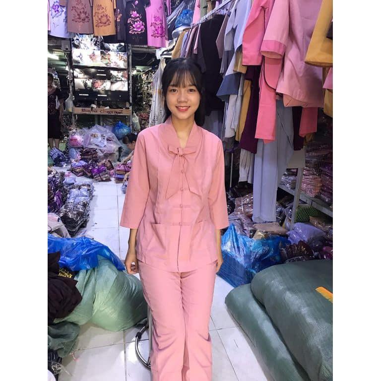 quần áo Phật tử cổ tàu cài chéo - đồ lam đi chùa Sen Hồng - set Phật tử nữ đẹp 0898553583