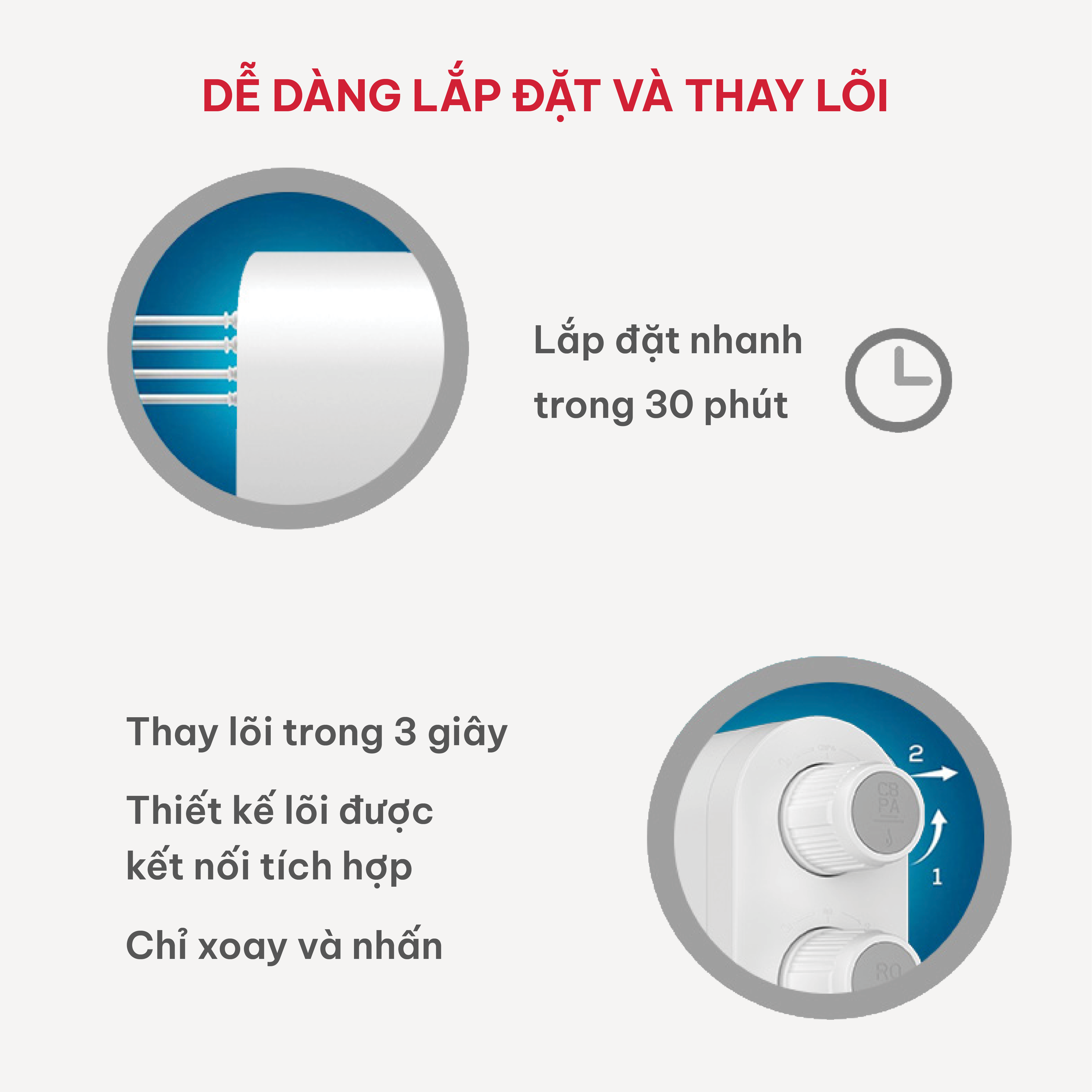 Màng lọc RO chuẩn Mỹ Công suất lọc 20 lít/h Tỷ lệ thu hồi nước tinh khiết lên đến 60% Tiết kiệm tới 71% lượng nước thải Bổ sung khoáng chất tốt qua 6 lõi
